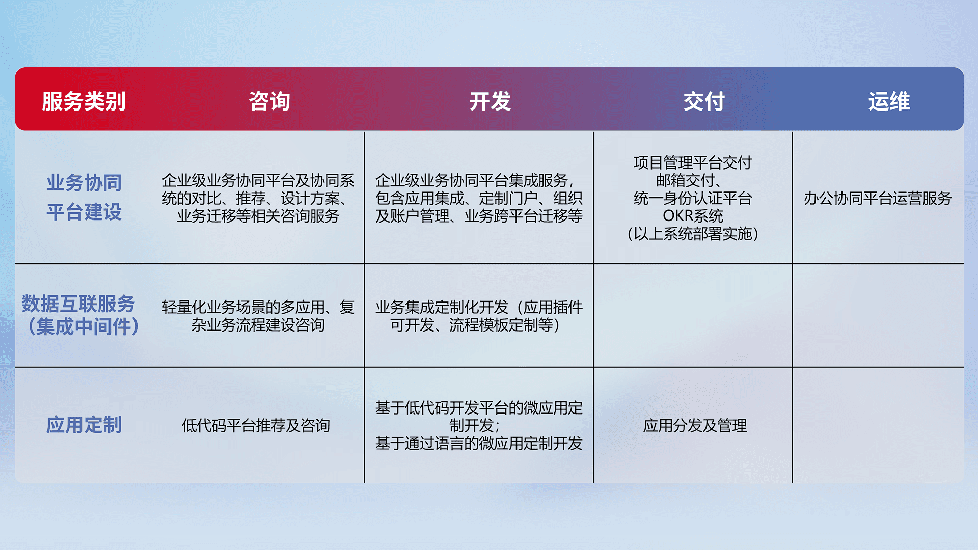 针对钉钉、、、企微、、、、IDaas等平台级产品提供产品的规划、、、、方案、、交付、、、、定制化开发等服务,,,实现如统一协同办公、、、、智能客户服务、、混合会议管理、、智能数据查询、、、等业务场景,,实现数字化转型。。。